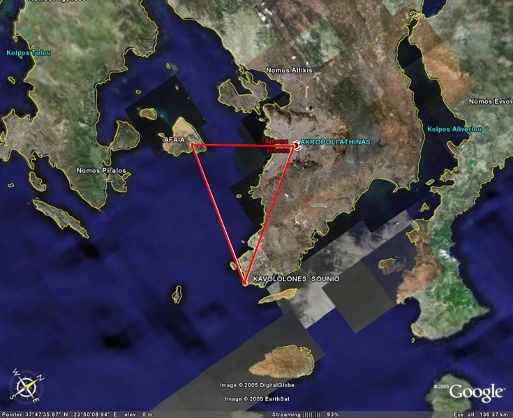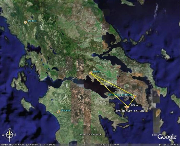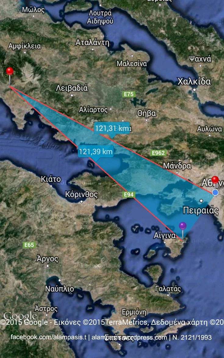 Το ισοσκελές τρίγωνο με κορυφή τον Ναό του Ποσειδώνα στο Σούνιο (γ.π. 37,6502 και γ.μ. 24,0245) και πλευρές τον Ναό της Αφαίας στην Αίγινα (γ.π. 37,7544 και γ.μ. 23,5329) και τον Ναό του Ηφαίστου στο Θησείο (γ.π. 37,9755 και γ.μ. 23,7216) έχει πλευρές μήκους 44,82 χιλιομέτρων (από τον Ναό του Ποσειδώνα στο Σούνιο ως τον Ναός της Αφαίας Αθηνάς στην Αίγινα) και 44,96 χιλιομέτρων (από τον Ναό του Ποσειδώνα στο Σούνιο ως τον Ναό του Ηφαίστου στο Θησείο). Όσο για το δεύτερο και εξίσου περιβόητο ισοσκελές τρίγωνο, έχει κορυφή τον Ναό του Απόλλωνα στους Δελφούς (γ.π. 38,4823 και γ.μ. 22,5012) και πλευρές τον Ναό της Αφαίας στην Αίγινα (γ.π. 37,7543 και γ.μ. 23,5332) και τον Παρθενώνα (γ.π. 37,9715 και γ.μ. 23,7266). Για την απόκλιση του μήκους των δύο πλευρών, το GPS μας λέει πως το ισοσκελές τρίγωνο έχει πλευρές μήκους 121,39 χιλιομέτρων (από τον Ναό του Απόλλωνα στους Δελφούς ως τον Ναό της Αφαίας στην Αίγινα) και 121,31 χιλιομέτρων (από τον Ναό του Απόλλωνα στους Δελφούς ως τον Παρθενώνα)! Μερικές δεκάδες μέτρα απόκλιση σε αποστάσεις δεκάδων χιλιομέτρων τις λες και αμελητέες.
