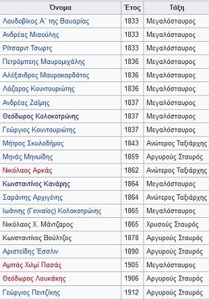 Ο πρώτος που τιμήθηκε με τον Μεγαλόσταυρο του Τάγματος του Σωτήρος ήταν ο Βασιλιάς της Βαυαρίας Λουδοβίκος Α΄, πατέρας του Βασιλιά Όθωνα κατά την ημέρα της θεμελίωσης των Ανακτόρων Αθηνών το 1836.