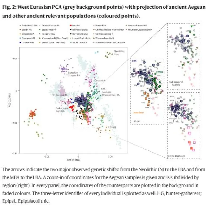 Η ομάδα προχώρησε και σε νέα συμπεράσματα σχετικά με την πληθυσμιακή δομή και τις μετακινήσεις των αρχαίων ανθρώπων. Ενώ οι πληθυσμοί της Μυκηναϊκής περιόδου από την Τίρυνθα στην Πελοπόννησο έως την Αττική ήταν γενετικά πολύ ομοιογενείς, στην Κρήτη και συγκεκριμένα στην αρχαία Κυδωνία (σημερινά Χανιά) φαίνεται ότι ντόπιοι κάτοικοι σε μεγάλο βαθμό είχαν αναμειχθεί με ομάδες, που έφτασαν στο νησί από διάφορες περιοχές της ηπειρωτικής Ελλάδας αλλά και της Κεντρικής Μεσογείου.