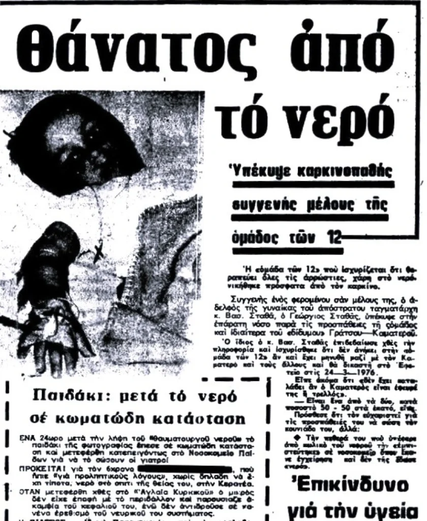Δημοσίευμα της Ελευθεροτυπίας. Γονείς 18 παιδιών, που νοσηλεύονται με λευχαιμία σταμάτησαν την κλασική θεραπεία και προμήθευσαν τα παιδιά τους με το νερό του Καματερού, με αποτέλεσμα ένα από αυτά να πεθάνει