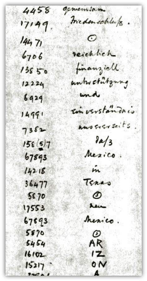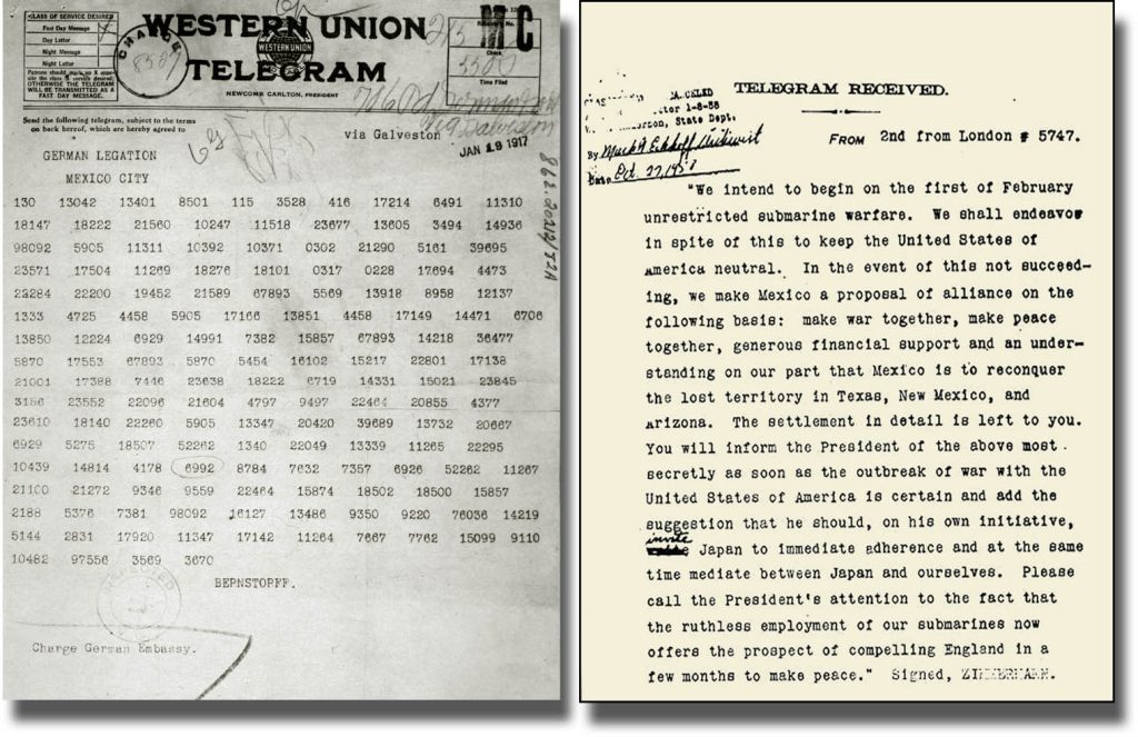 Το γερµανικό υπουργείο Εξωτερικών ανέφερε προς την κυβέρνηση του Μεξικό ότι θα βοηθούσε έτσι ώστε να καταλάβει τις Πολιτείες του Τέξας, της Αριζόνα, και του Νέο Μεξικό. Το τηλεγράφηµα υποκλάπηκε από τις βρετανικές µυστικές υπηρεσίες και γνωστοποιήθηκε στην κυβέρνηση των ΗΠΑ.