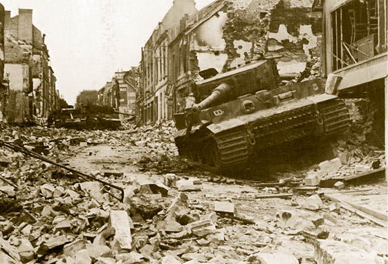 Καθώς το άρμα του Βίτμαν παρουσιάσθηκε μπροστά στο άνοιγμα του δρόμου και μάλιστα με την κάννη ευθεία εμπρός σε θέση-«ώρα 12», εντελώς ακίνδυνα δηλαδή, ο πυροβολητής έβαλλε, για να φύγει ωστόσο το βλήμα μόλις επάνω από το πυροβόλο του «Τίγρη», σκάζοντας στο απέναντι κτήριο. Έτσι ο Βίτμαν γλίτωσε από το κτύπημα συνεχίζοντας την πορεία του όχι όμως και το Μαρκ IV που δέχθηκε ένα νέο βλήμα από το Σέρμαν και εκτός ελέγχου πλέον, κύλησε προς τα εμπρός. Καθώς ο Βρετανός γεμιστής προσπαθούσε να επαναγεμίσει το πυροβόλο του, ο τρίτος και τελευταίος «Τίγρης» πέρασε από μπροστά του ακολουθώντας τον Βίτμαν. Αυτό το άρμα όμως έγινε στόχος ένος Κρόμγουελ. Και αυτός όμως ο Βρετανός πυροβολητής, παρ’ όλη την μικρή απόσταση, έχασε για λίγο τον στόχο του.