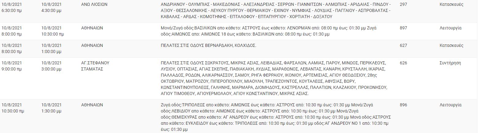 Ειδικότερα για σήμερα, Τρίτη, 10 Αυγούστου, ο ΔΕΔΔΗΕ έχει προγραμματίσει διακοπές ρεύματος στο κέντρο της Αθήνας στον Άγιο Άγιο Στέφανο, στη Σταμάτα και στα Άνω Λιόσια.