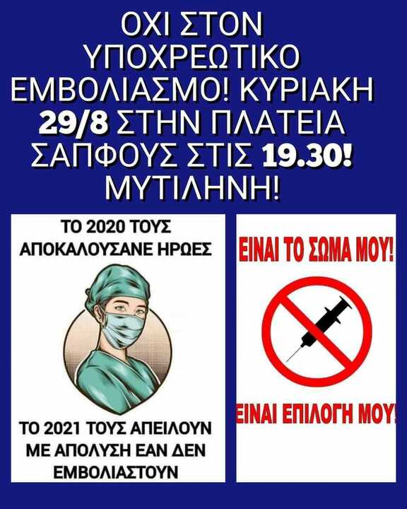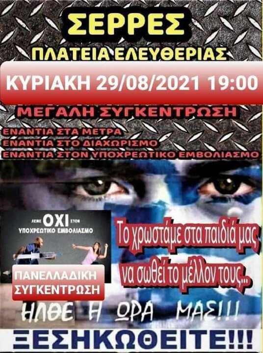 Την επόμενη Κυριακή 29 Αυγούστου αναμένεται να πραγματοποιηθεί μεγάλη συγκέντρωση κατά του υποχρεωτικού εμβολιασμού και των μέτρων Απαρτχάιντ που επιβάλει η κυβέρνηση του Κυριάκου Μητσοτάκη.