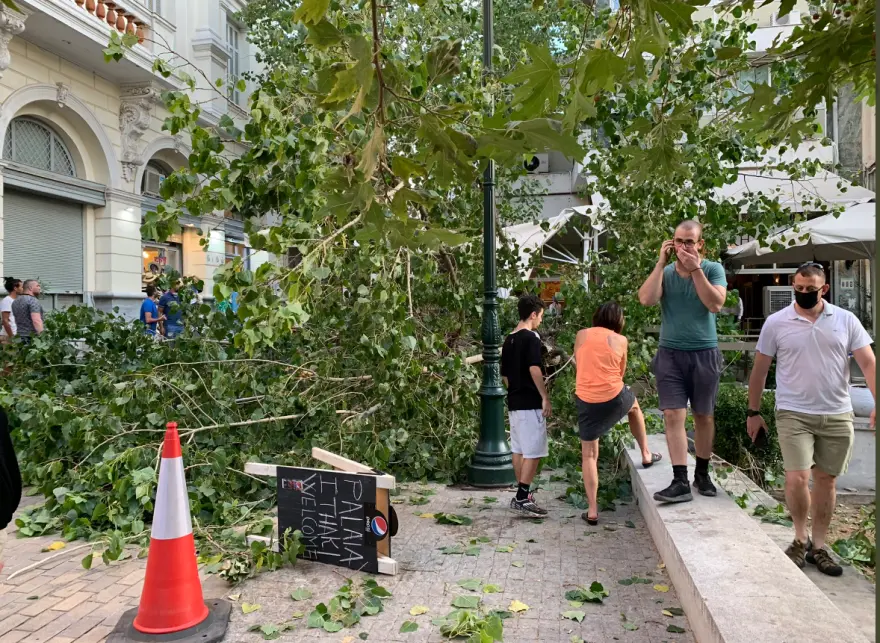 Το δέντρο έπεσε σε εστιατόριο κοντά στη Μητρόπολη Αθηνών, ξαφνιάζοντας το προσωπικό του καταστήματος, πελάτες και περαστικούς.