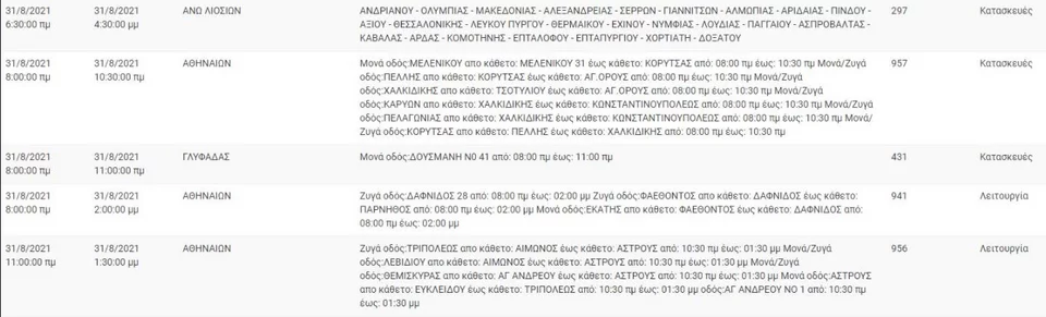 Ο ΔΕΔΔΗΕ, για σήμερα Τρίτη 31 Αυγούστου, έχει προγραμματίσει διακοπή ρεύματος σε αρκετές περιοχές της Αττικής, στις οποίες περιλαμβάνονται το κέντρο της Αθήνας, στα Άνω Λιόσια και Γλυφάδα.