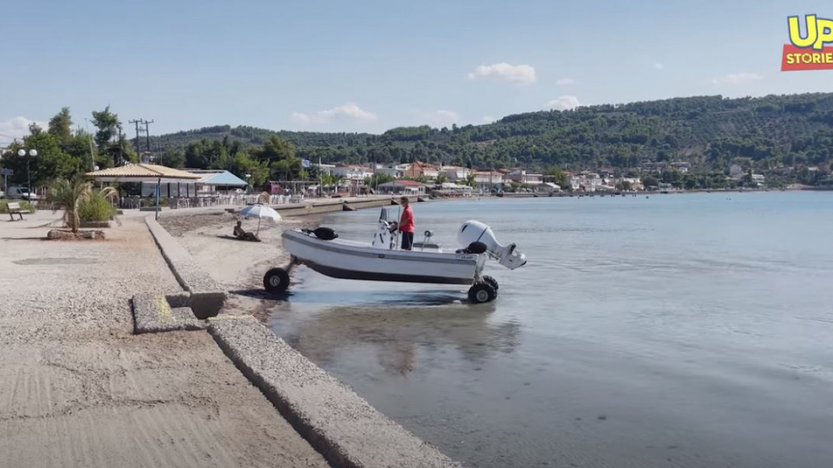 Εμείς μπορεί να μην εντοπίσαμε στο Μέτσοβο Βαπόρι, όμως μείναμε πραγματικά με το στόμα ανοιχτό όταν στην παραλία του Θεολόγου Φθιώτιδας ξαφνικά μπροστά στα μάτια μας ο ιδιοκτήτης ενός αμφίβιου φουσκωτού σκάφους βγήκε να κάνει τα ψώνια του στην στεριά με το πλωτό του μέσο.
