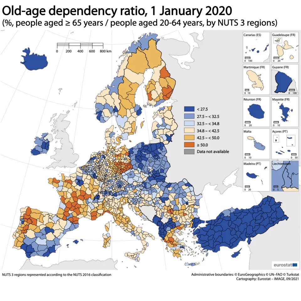 Ο χάρτης ανά χώρα και ανά Περιφέρεια προκαλεί σοκ, αφού ήδη η Ελλάδα καταγράφεται στις χώρες με το μεγαλύτερο ποσοστό εξάρτησης των ηλικιωμένων από τους νεώτερους, δηλαδή πρακτικά με το μεγαλύτερο ποσοστό των ανθρώπων άνω των 65 ετών σε αναλογία με τους εργαζόμενους.
