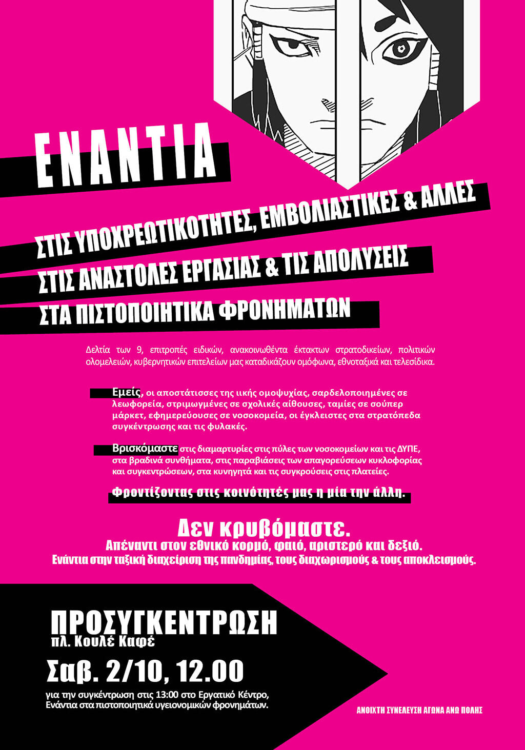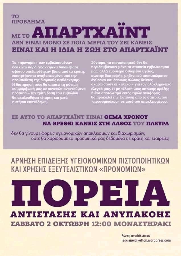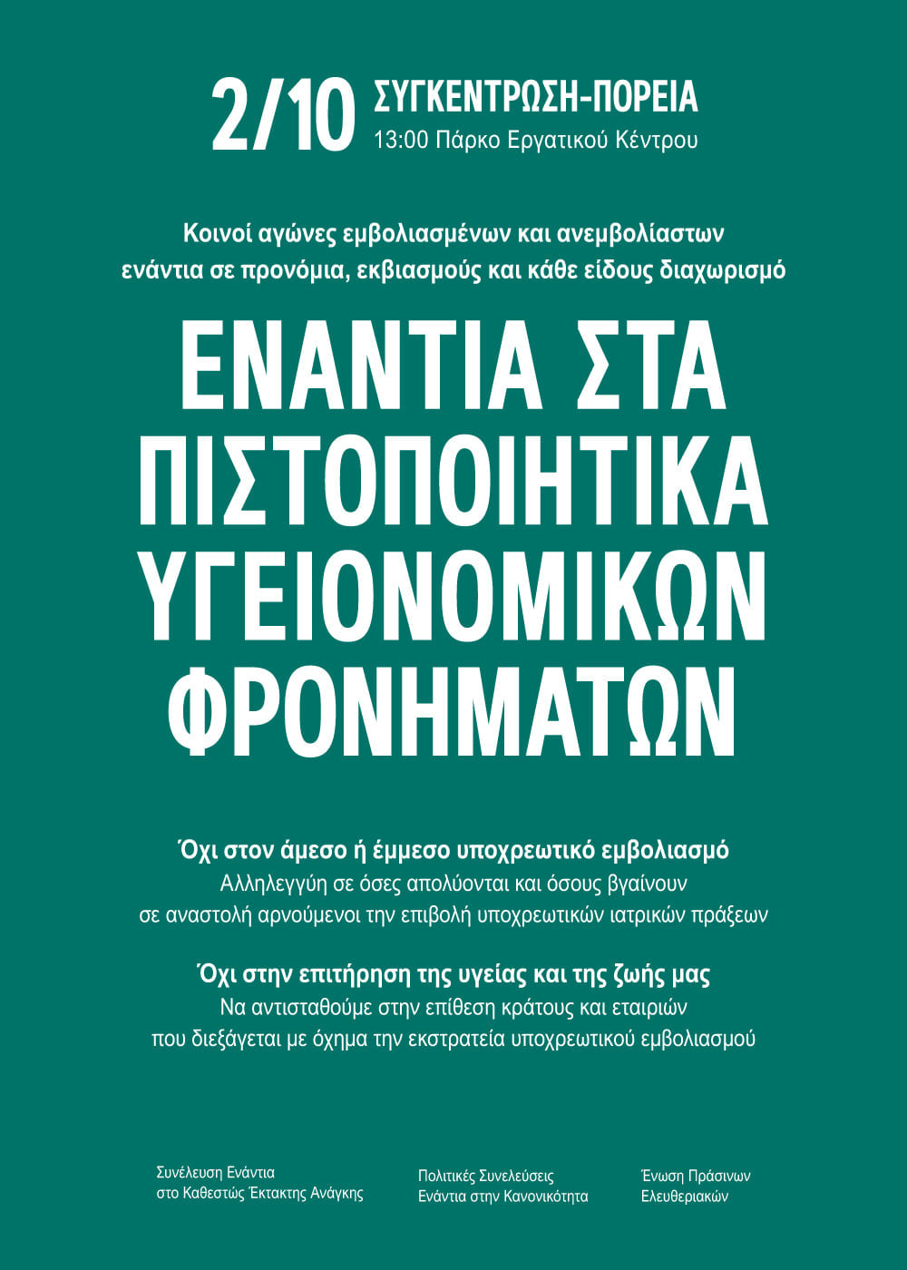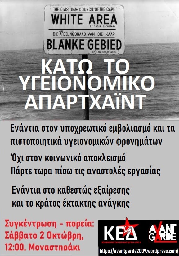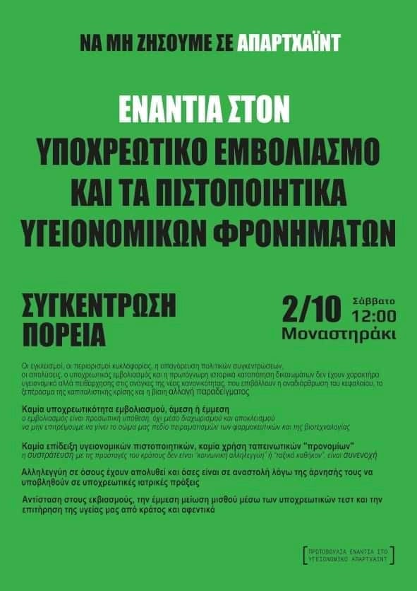 Αντίσταση στους εκβιασμούς, την έμμεση μείωση μισθού μέσω των υποχρεωτικών τεστ και την επιτήρηση της υγείας μας από κράτος και αφεντικά».