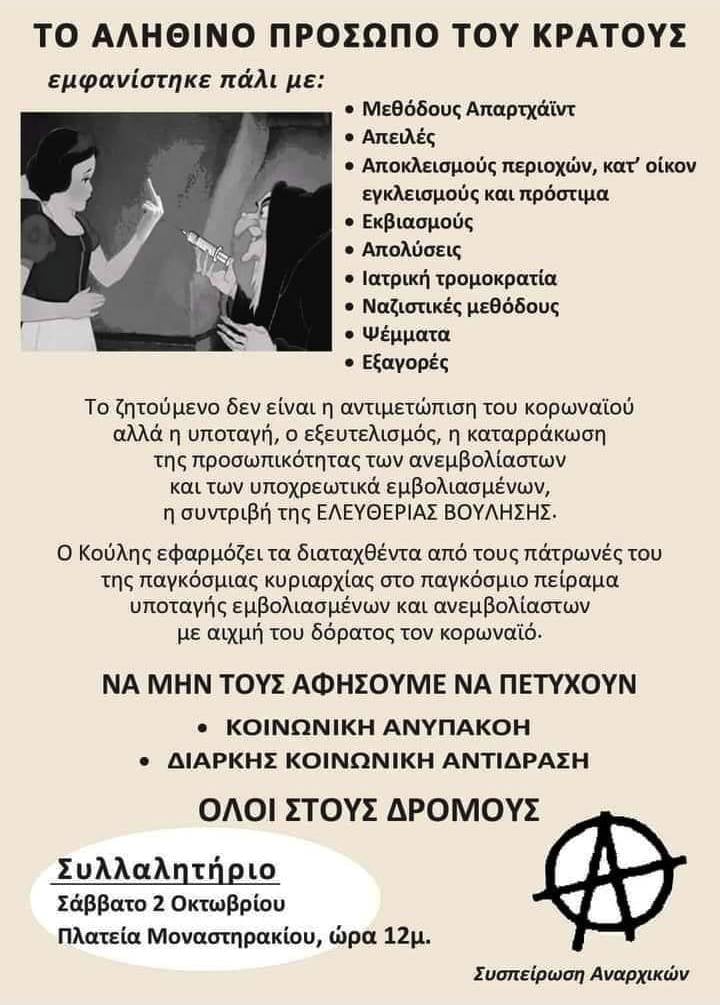 Στη συγκέντρωση της Αθήνας συμμετέχουν οι εξής ομάδες: Κόντρα Δυστοπία, Avantgarde, Συσπείρωση Αναρχικών, Πρωτοβουλία ενάντια στο υγειονομικό απαρτχάιντ, Λέσχη Ανειδίκευτων.