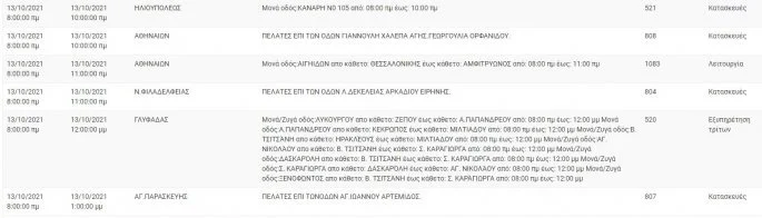 Αναλυτικά οι πίνακες με τις περιοχές της Αττικής και τις ώρες που θα σημειωθεί διακοπή ρεύματος: