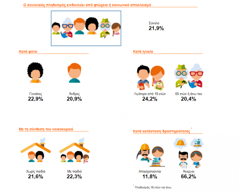 Στα επιμέρους στοιχεία της Ελλάδας, οι γυναίκες είναι σε μεγαλύτερο ποσοστό αντιμέτωπες με τη φτώχεια (28,8%) σε σχέση με τους άνδρες (26,1%) ενώ ιδιαίτερη ανησυχία προκαλεί η φτώχεια στους κάτω των 18 ετών, όπου το ποσοστό ανέρχεται στο 31,5%.