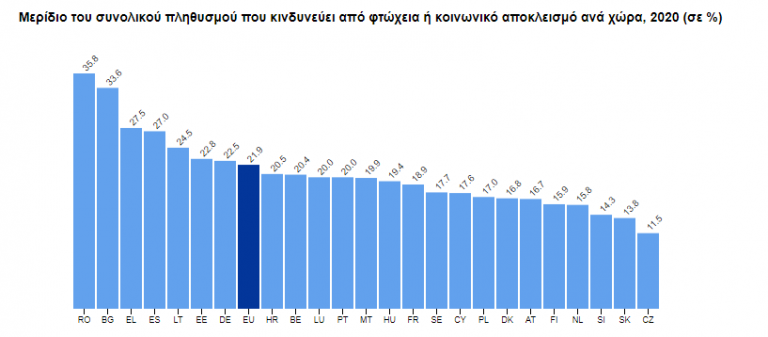 Στον αντίποδα , τα χαμηλότερα ποσοστά ατόμων που κινδυνεύουν από φτώχεια ή κοινωνικό αποκλεισμό καταγράφηκαν στην Τσεχία (11,5%), τη Σλοβακία (13,8%), τη Σλοβενία ​​(14,3%), τις Κάτω Χώρες (15,8%) και τη Φινλανδία (15,9%).