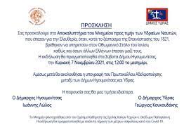 Την Κυριακή 7 Νοεμβρίου 2021 θα λάβει χώρα η τελετή αποκαλυπτηρίων του μνημείου στη κεντρική πλατεία των Συβότων, με τα ονόματα των Υδραίων πεσόντων και θα ακολουθήσει υπογραφή Πρωτοκόλλου Αδελφοποίησης μεταξύ των δύο Δήμων. Σε δηλώσεις του αναφορικά με την εν λόγω εκδήλώση ο Δήμαρχος της Ύδρας Γιώργος Κουκουδάκης επισήμανε “Τιμούμε την ιστορία της Ύδρας και φροντίζουμε να μάθουν και οι επόμενες γενιές την μεγάλη προσφορά του Νησιού μας στην Ελευθερία της Ελλάδας μας”!