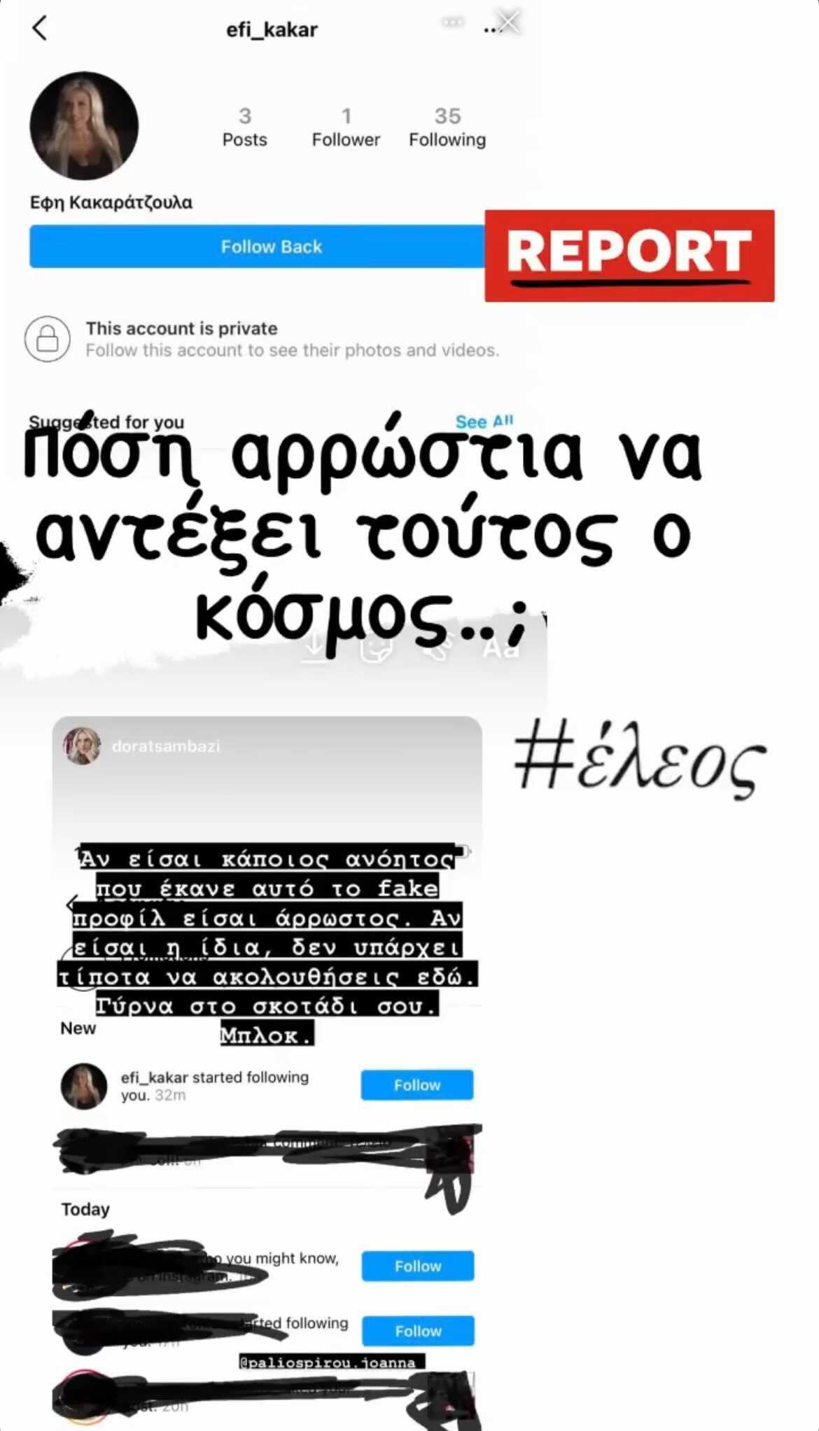 Οπως φαίνεται από ανάρηση που έκανε η Ιωάννα, ένας λογαριασμός στο Instagram με το όνομα της δράστριας της επίθεσης εις βάρος της την έκανε… follow στο Instagram. «Πόση αρρώστια να αντέξει τούτος ο κόσμος», γράφει η Ιωάννα στη πρώτη της ανάρτηση και παραθέτει στη συνέχεια παραθέτει το μήνυμα: «Αν είσαι κάποιος ανόητος που έκανε αυτό το fake προφίλ είσαι άρρωστος. Αν είσαι η ίδια, δεν υπάρχει τίποτα να ακολουθήσεις εδώ. Γύρνα στο σκοτάδι σου. Μπλοκ».