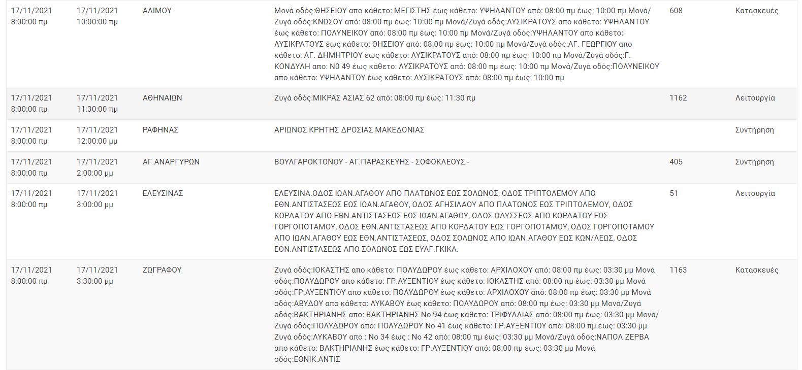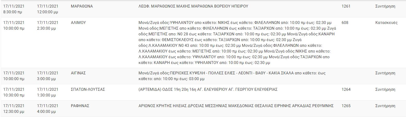 Ο ΔΕΔΔΗΕ, για σήμερα Τετάρτη 17 Νοεμβρίου, έχει προγραμματίσει διακοπή ρεύματος σε αρκετές περιοχές της Αττικής, στις οποίες περιλαμβάνονται το κέντρο της Αθήνας, ο Άλιμος, η Ραφήνα και ο Μαραθώνας.