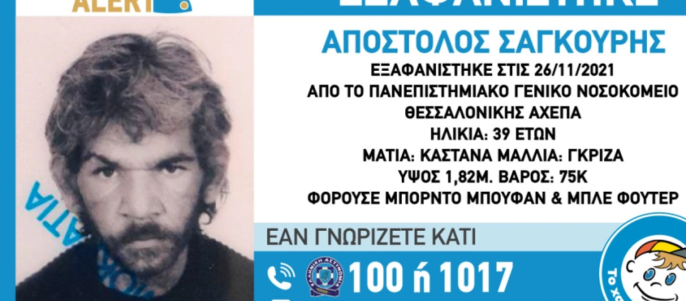 Εξαφανίστηκε από την περιοχή του Πανεπιστημιακού Γενικού Νοσοκομείου Θεσσαλονίκης ΑΧΕΠΑ στις 26 Νοεμβρίου, ο Σαγκούρης Απόστολος, 39 ετών.
