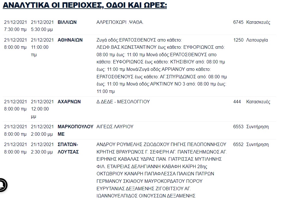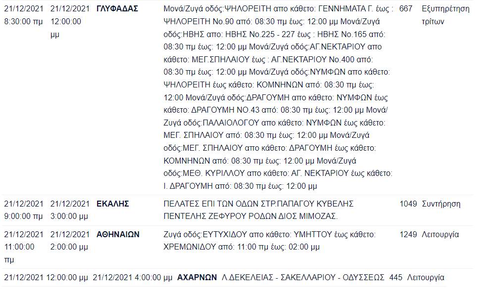 Ο ΔΕΔΔΗΕ, έχει προγραμματίσει για σήμερα Τρίτη 21 Δεκεμβρίου, διακοπή ρεύματος σε μια σειρά περιοχές της Αττικής.