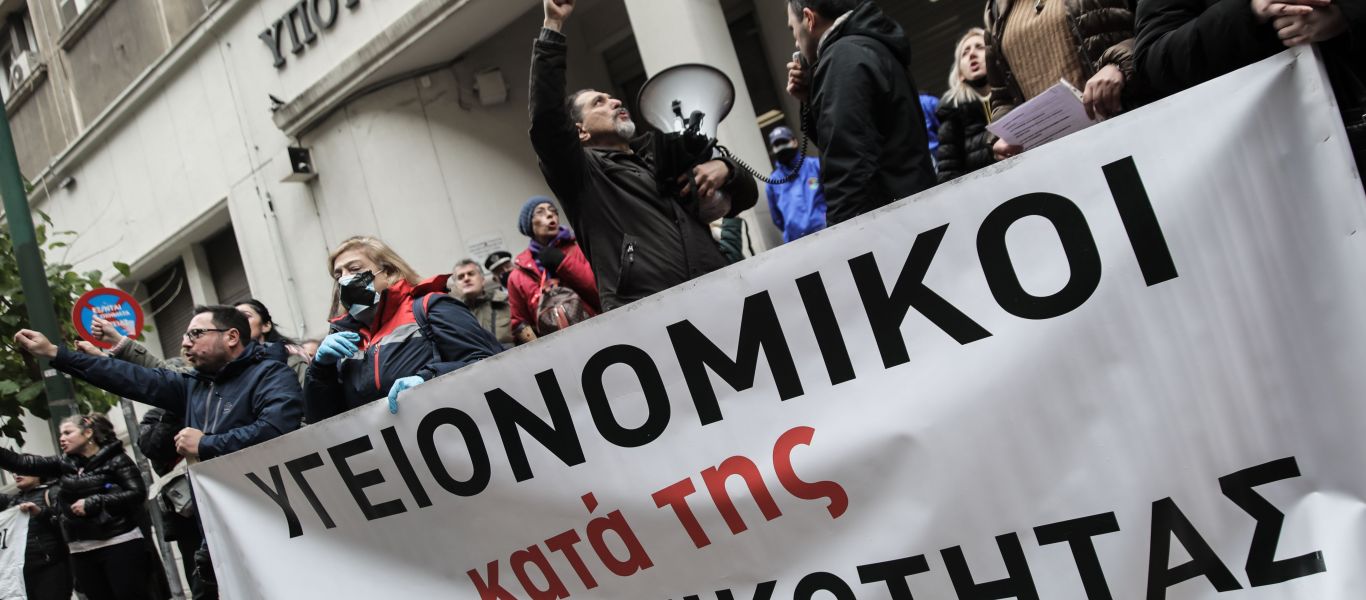 Συγκέντρωση κατά του υποχρεωτικού εμβολιασμού και των αναστολών εργασίας πραγματοποιούν το πρωί της Τετάρτης υγειονομικοί που έχουν συγκεντρωθεί έξω από τη Βουλή.