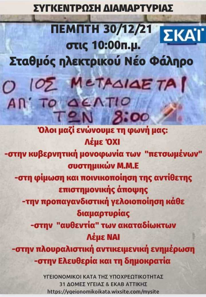 Οι υγειονομικοί στο σχετικό αφισάκι που τύπωσαν κεντρικό τους σύνθημα κάνουν το: «Ο ιός μεταδίδεται από το δελτίο των 8». Στο στόχαστρο τους βρίσκονται όχι μόνο ο ΣΚΑΪ(εξ ου και η κινητοποίηση στο Φάληρο) αλλά και τα υπόλοιπα καλοταϊσμένα από τα «πακέτα Πέτσα» μέσα που λοιδορούν κάθε διαφορετική από το επίσημο κυβερνητικό αφήγημα, άποψη.
