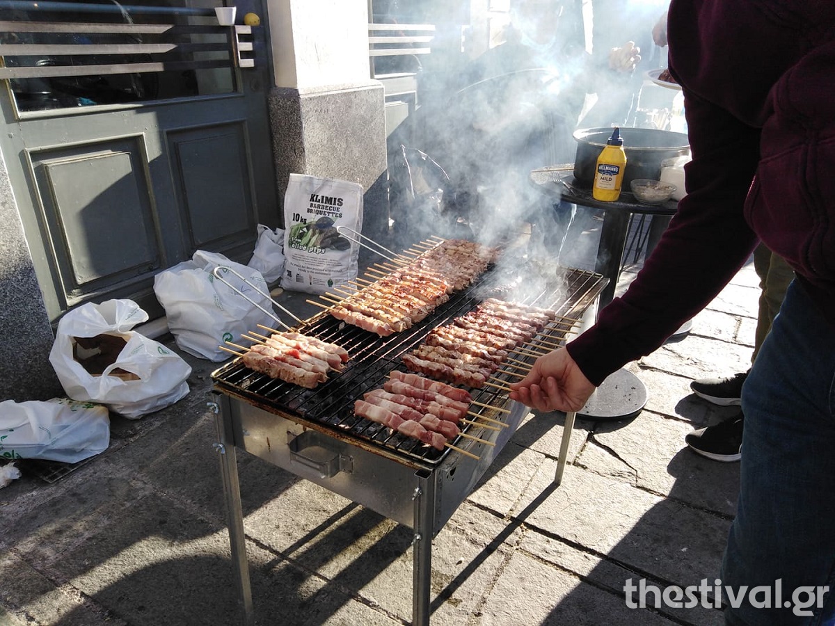 Λόγω των καλών καιρικών συνθηκών, ορισμένοι ιδιοκτήτες καταστημάτων εστίασης επέλεξαν να βγάλουν έξω τις ψησταριές τους για να ψήσουν σουβλάκια, λουκάνικα και πανσέτες.
