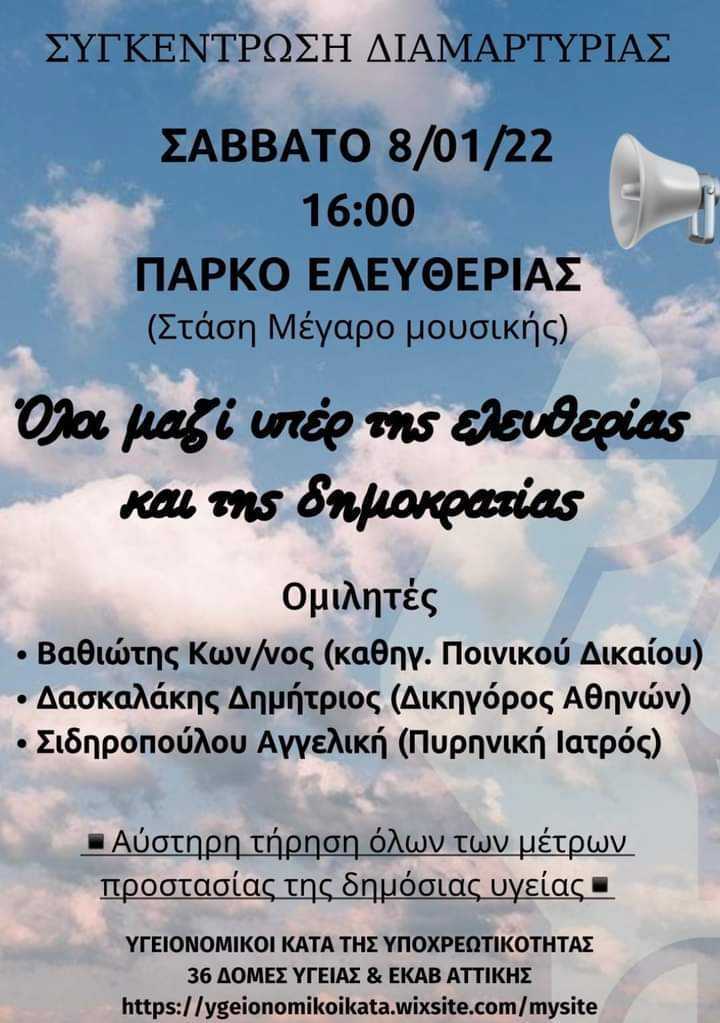 Την πρώτη μεγάλη συγκέντρωση για το 2022 θα πραγματοποιήσουν υγειονομικοί και πολίτες που διαφωνούν με τον υποχρεωτικό εμβολιασμό το Σάββατο 8 Ιανουαρίου στις 16:00.