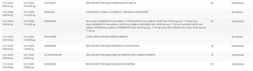 Αναλυτικά οι πίνακες με τις περιοχές που έχει προγραμματιστεί διακοπή ρεύματος: