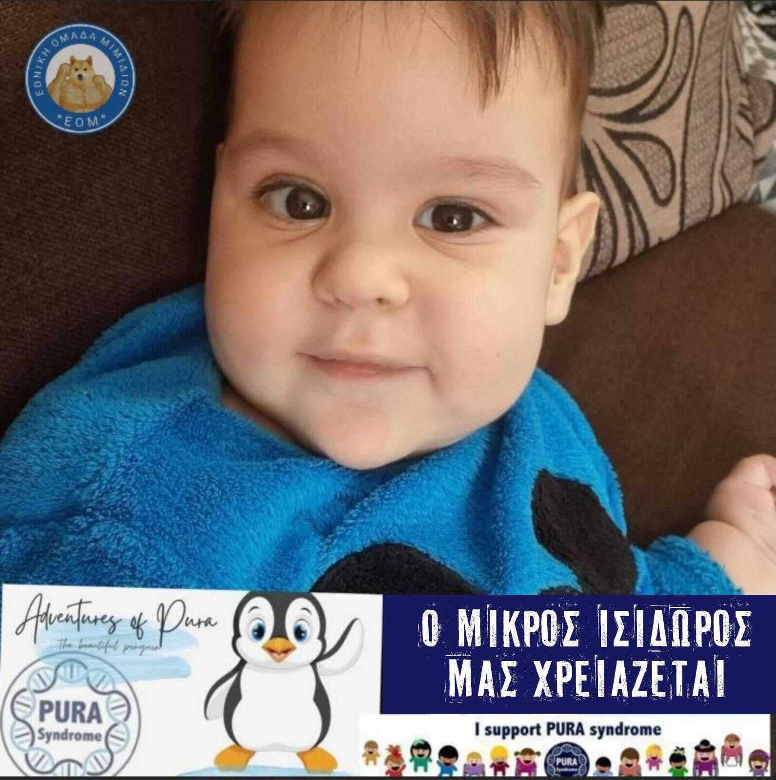 Η οικογένειά του κάνει έκκληση για βοήθεια, καθώς το παιδί πάσχει από μία σπάνια ασθένεια, το σύνδρομο pura, που είναι το 4ο στην Ελλάδα. Έχει ανάγκη από οικονομική βοήθεια για μία δύσκολη επέμβαση και όποιος μπορεί καλό είναι να συνεισφέρει.