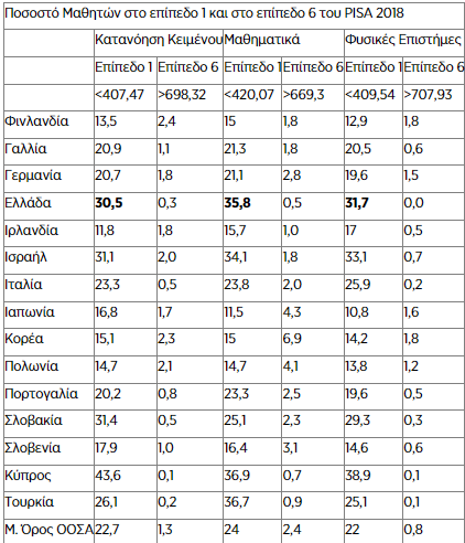 Στον αντίποδα, στις υψηλές επιδόσεις στο επίπεδο 6 δηλαδή, στα Μαθηματικά η Κορέα έχει το 6,9% των μαθητών και η Ιαπωνία το 4,3%. Οι χώρες της Ευρώπης βρίσκονται από 1,8 έως 4%. Η Τουρκία είναι στο 0,9%, ενώ η Ελλάδα στο 0,5%. Έχουμε δηλαδή τους μισούς αριστούχους στα Μαθηματικά από την Τουρκία. Στις Φυσικές Επιστήμες έχουμε 0% και στην κατανόηση κειμένου 0,3%. Δεν είναι, λοιπόν, ότι αδιαφορούμε για τους αδύνατους μαθητές. Αδιαφορούμε για όλους τους μαθητές, αδύνατους ή δυνατούς, αφού όλοι δυνατοί και αδύνατοι είναι λιγότεροι από των προηγμένων χωρών.
