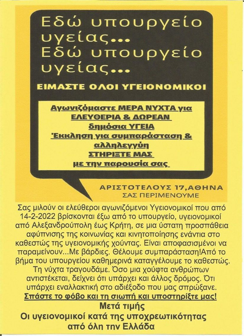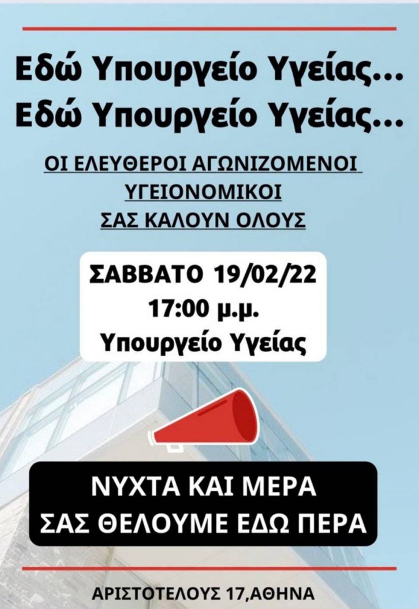 «Εδώ Υπουργείο Υγείας! Εδώ Υπουργείο Υγείας! Σας μιλούν οι Ελεύθεροι αγωνιζόμενοι Υγειονομικοί. Αυτό το Σάββατο και για 6η συνεχόμενη μέρα, σε μια ύστατη προσπάθεια αφύπνισης της κοινωνίας, ενάντια στο καθεστώς της υγειονομικής χούντας, σας καλούμε να συνταχθείτε μαζί μας! Είμαστε αποφασισμένοι. Υπάρχει εναλλακτική στο αδιέξοδο που μας σπρώξανε. Σπάστε τη σιωπή. Γκρεμίστε τον φόβο. Σάββατο 19/2/2022, 17:00 μ.μ. στο Υπουργείο Υγείας, Αριστοτέλους 17. Σας περιμένουμε. Δεν υποχωρούμε αν δεν δικαιωθούμε».