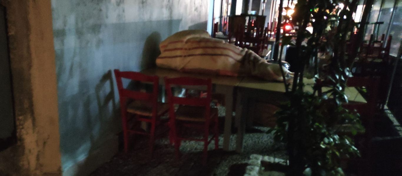 Η εικόνα από τις Σέρρες σφίγγει το στομάχι. Άστεγος έχει ενώσει δύο τραπέζια σε κλειστό κατάστημα της πόλης και έχει πέσει για ύπνο, με το κρύο να είναι τσουχτερό. Δεν έχει κανένα να νιαστεί για εκείνον.