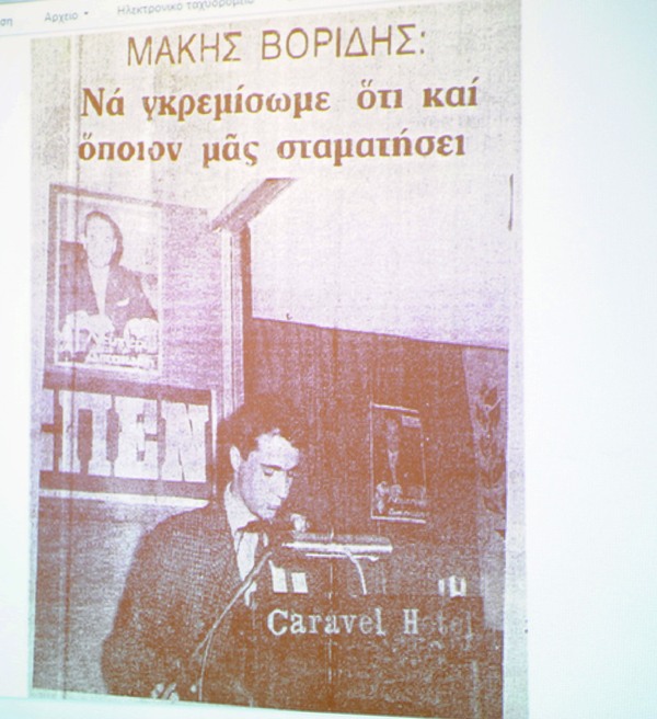 Διαφάνεια 2 (04:20 του βίντεο) – Ο Μάκης Βορίδης ομιλεί μπροστά από αφίσα του Γεώργιου Παπαδόπουλου
