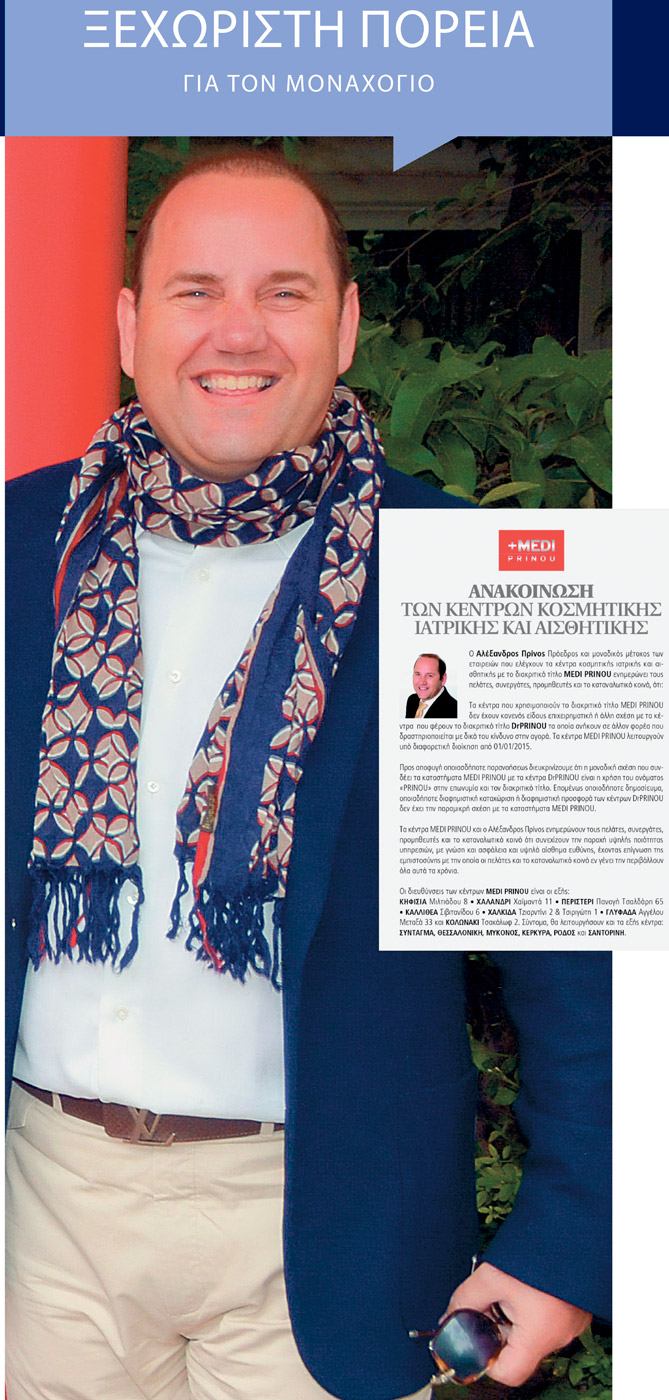 Μέσω αυτής της ανακοίνωσης, λοιπόν, που βγήκε σε εφημερίδες και περιοδικά, ο ίδιος τονίζει τα εξής: «Ενημερώνω τους πελάτες, συνεργάτες, προμηθευτές και το καταναλωτικό κοινό ότι τα κέντρα που χρησιμοποιούν τον διακριτικό τίτλο “MEDI PRINOU” δεν έχουν κανενός είδους επιχειρηματική ή άλλη σχέση με τα κέντρα που φέρουν τον διακριτικό τίτλο “Dr PRINOU”, τα οποία ανήκουν σε άλλον φορέα που δραστηριοποιείται με δικό του κίνδυνο στην αγορά. Τα κέντρα “MEDI PRINOU” λειτουργούν υπό διαφορετική διοίκηση από την 01.01.2015. Προς αποφυγή οποιασδήποτε παρανοήσεως διευκρινίζουμε ότι η μοναδική σχέση που συνδέει τα καταστήματα “MEDI PRINOU” με τα κέντρα “Dr PRINOU” είναι η χρήση του ονόματος PRINOU στην επωνυμία και τον διακριτικό τίτλο. Επομένως οποιοδήποτε δημοσίευμα, οποιαδήποτε διαφημιστική καταχώρηση ή διαφημιστική προσφορά των κέντρων “Dr PRINOU” δεν έχει καμία σχέση με τα καταστήματα “MEDI PRINOU”. Tα κέντρα “MEDI PRINOU” και ο Αλέξανδρος Πρίνος ενημερώνουν τους πελάτες, συνεργάτες, προμηθευτές και το καταναλωτικό κοινό ότι συνεχίζουν την παροχή υψηλής ποιότητας υπηρεσιών με γνώση, ασφάλεια και υψηλό αίσθημα ευθύνης, έχοντας επίγνωση της εμπιστοσύνης με την οποία οι πελάτες και το καταναλωτικό κοινό εν γένει τα περιβάλλουν όλα αυτά τα χρόνια».