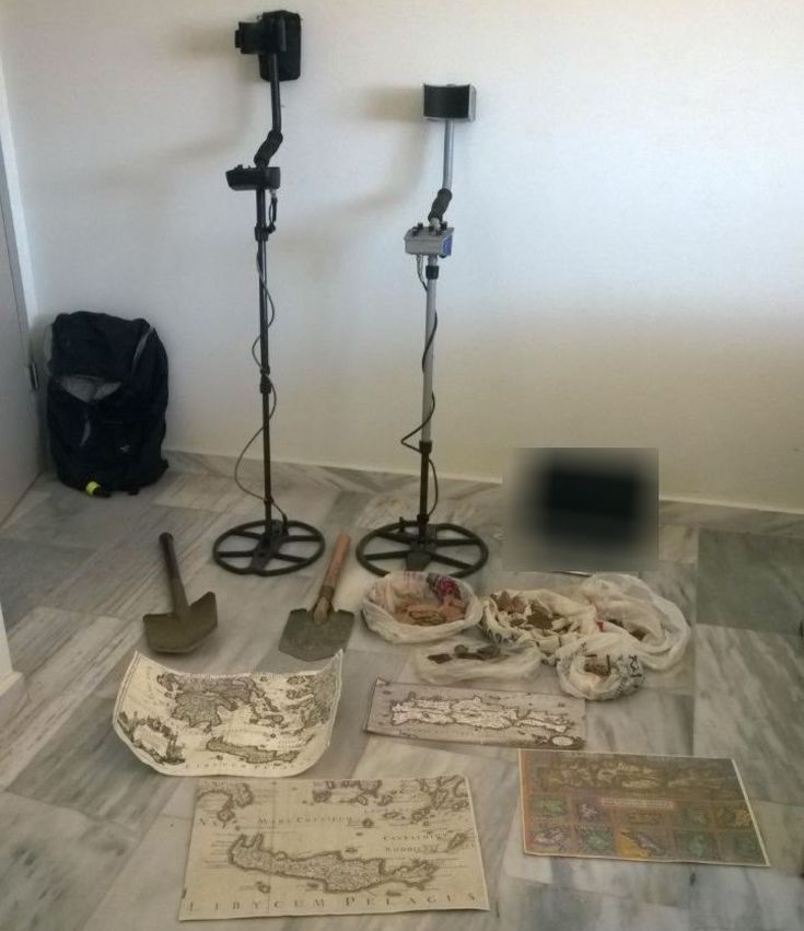 Στη συνέχεια, από αστυνομικούς της ανωτέρω Υπηρεσίας, πραγματοποιήθηκε έλεγχος σε Ι.Χ.Ε. αυτοκίνητο στο οποίο επέβαιναν ο 33χρονος με τον 35χρονο, κατά τη διάρκεια του οποίου βρέθηκαν και κατασχέθηκαν πήλινα, χάλκινα και μεταλλικά αντικείμενα τα οποία εμπίπτουν στη Νομοθεσία « Περί προστασίας Αρχαιοτήτων» και πέντε χάρτες οι οποίοι απεικόνιζαν την Κρήτη και τον εν λόγω αρχαιολογικό χώρο.