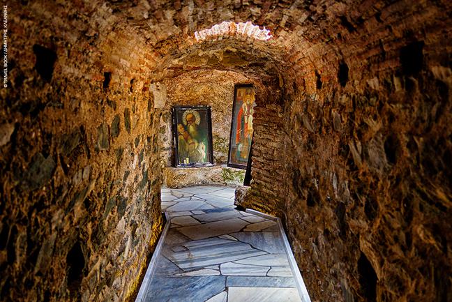 «Είναι προφανές από το σχήμα και το μέγεθος ότι δεν πρόκειται για λατρευτικό χώρο, αλλά για ένα σύστημα αγωγών θέρμανσης νερού» εξηγεί ο αρχιτέκτονας, δείχνοντας τη διαφορά ανάμεσα στη ρωμαϊκή και πρωτοχριστιανική τοιχοποιία: «Στους δύο μικρούς χώρους φυλακίστηκε και μαρτύρησε ο Άγιος Δημήτριος. Μάλιστα, μια τοιχογραφία του 14ου αιώνα που απεικονίζει τον Άγιο με σγουρά μαλλιά (βοστρύχους) και στην οποία αναγράφεται το όνομά του, υπογραμμίζει το γεγονός. Πρόκειται μια τοιχογραφία με τρεις προηγούμενες επιστρώσεις»….