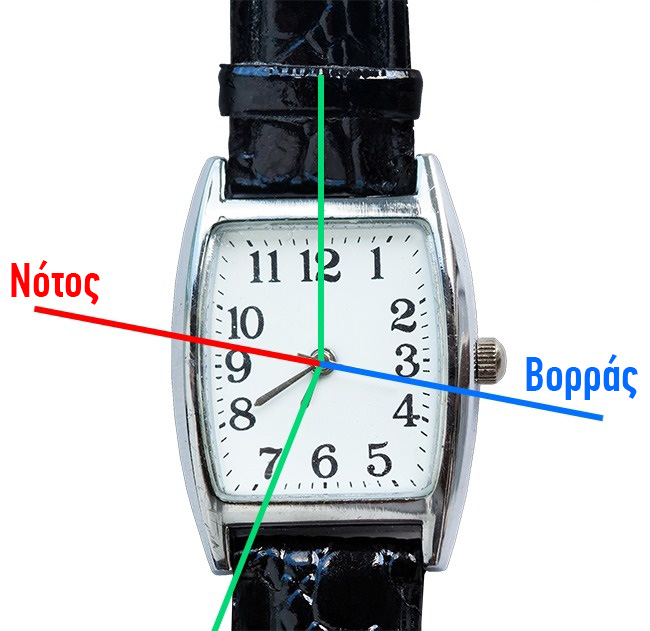 Όταν ο ήλιος βρίσκεται ψηλά, μπορείτε να χρησιμοποιήσετε το ρολόι σας και ως πυξίδα. Αν βρίσκεστε στο βόρειο ημισφαίριο, τοποθετήστε το πάνω σε μία λεία επιφάνεια ή τουλάχιστον την παλάμη σας. Ο δείκτης της ώρας πρέπει να βλέπει προς τη μεριά του ήλιου. Διαιρέστε τη γωνία μεταξύ του δείκτη της ώρας και του αριθμού 12 στο καντράν, με το 2. Το κέντρο της γωνίας θα είναι ο Νότος και ο Βορράς θα βρίσκεται στην αντίθετη μεριά. Μπορείτε να βρείτε περισσότερες πληροφορίες εδώ.