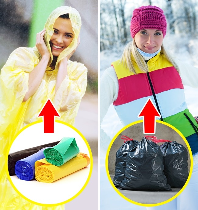 Εννοείται πως θα πάρετε σακούλες σκουπιδιών στις εκδρομές σας, για να πετάτε τα σκουπίδια σας και να προστατέψετε το περιβάλλον. Όμως γνωρίζατε ότι μπορούν να μεταμορφωθούν εύκολα και σε αδιάβροχο για εσάς ή τα προσωπικά σας αντικείμενα; Προστασία από τον παγετό Τυλιχθείτε με τις σακούλες και φορέστε όσα περισσότερα ρούχα μπορείτε από πάνω. Αυτό θα σας προστατέψει περισσότερο από τον παγετό.
