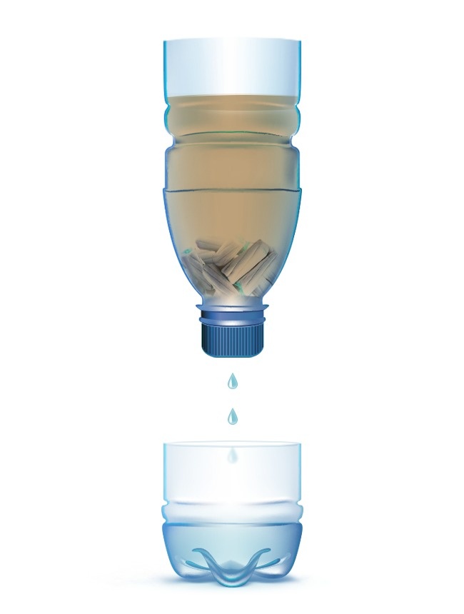 Αυτή η τεχνική καθαρισμού του νερού απέχει πολύ από την τελειότητα, όμως δεν έχετε πολλές επιλογές σε μια κατάσταση έκτακτης ανάγκης. Κόψτε ένα μπουκάλι στη μέση και γυρίστε το ανάποδα. Ξεφτίστε ένα ταμπόν και τοποθετήστε το στο λαιμό του μπουκαλιού. Ανοίξτε μία τρύπα στο καπάκι, για να στάζει το «φιλτραρισμένο» νερό.