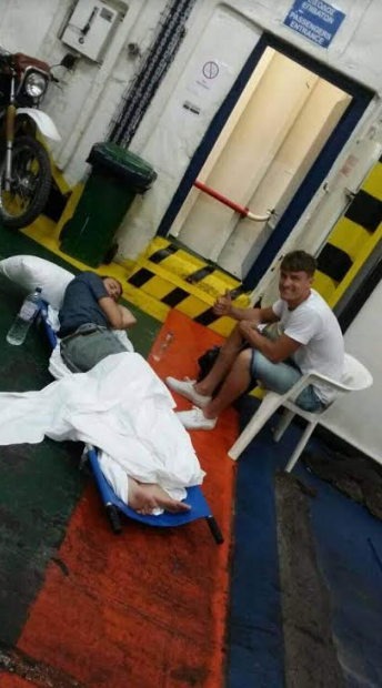 Το πλήρωμα του καραβιού επίσης δεν επέτρεψε στον ασθενή να ανέβει στο κατάστρωμα του καραβιού. Ο ασθενής παρέμεινε στο γκαράζ του καραβιού πάνω σε φορείο με το φίλο μου χωρίς συνοδό ιατρό. Δέστε φωτογραφίες.