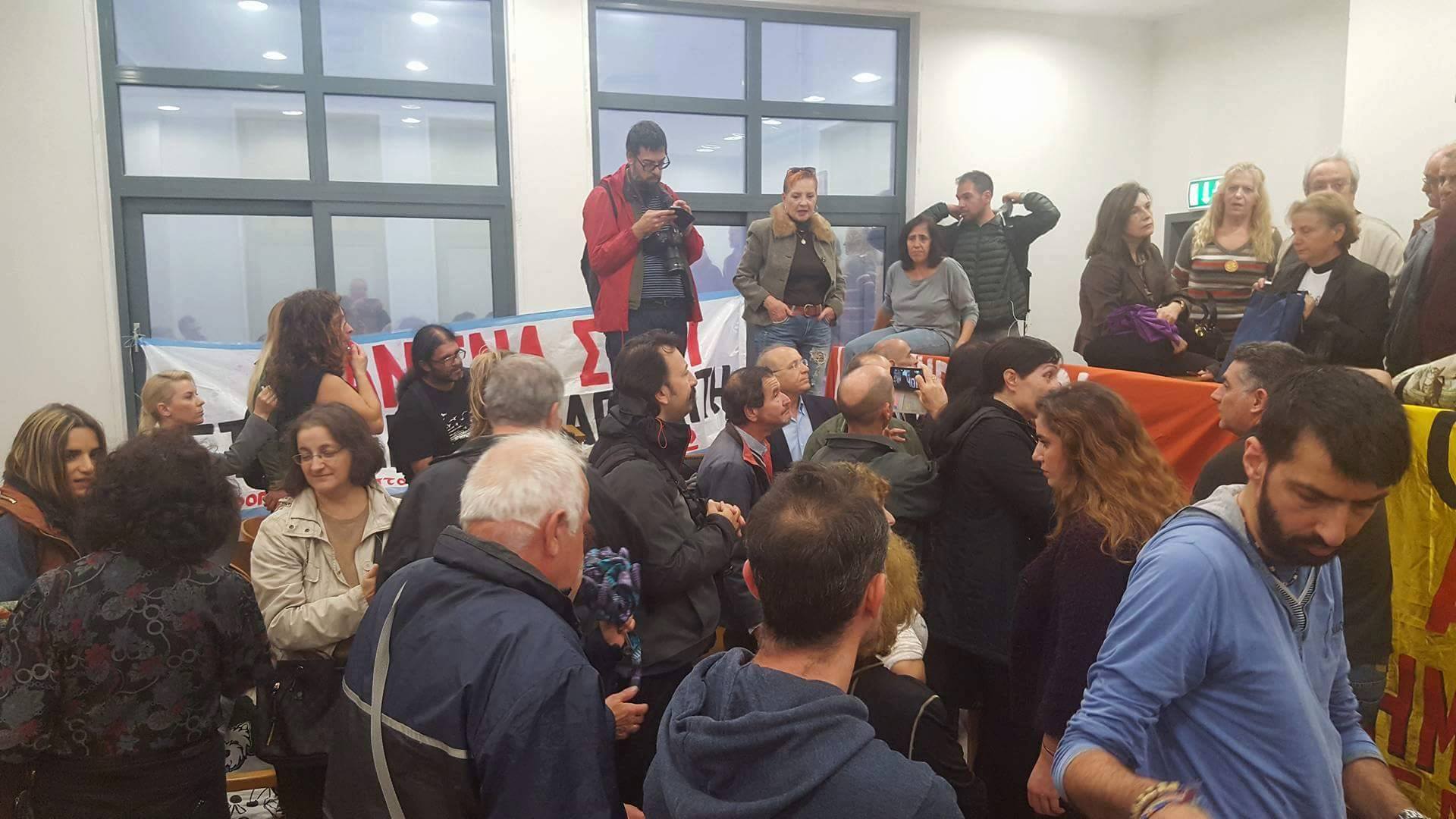 «Η κυβέρνηση ΣΥΡΙΖΑ-ΑΝΕΛ αναβαθμίζει την καταστολή στέλνοντας τα ΜΑΤ στα δικαστήρια», έλεγαν μεταξύ άλλων και παράλληλα “έφραξαν” με πανό την είσοδο των Υ.ΜΕ.Τ στην αίθουσα 7 όπου διενεργούνταν εκείνη την ώρα εκούσιος πλειστηριασμός.