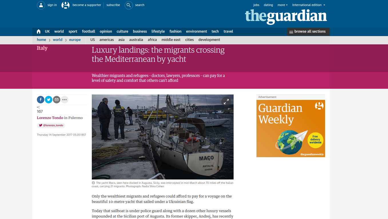 Η Guardian αναφέρει ότι περίπου 883 μετανάστες έφτασαν στη Σικελία με γιοτ από τον Ιανουάριο έως τον Αύγουστο του 2017 ενώ άλλοι 682 ταξίδεψαν με τον ίδιο τρόπο το 2016.
