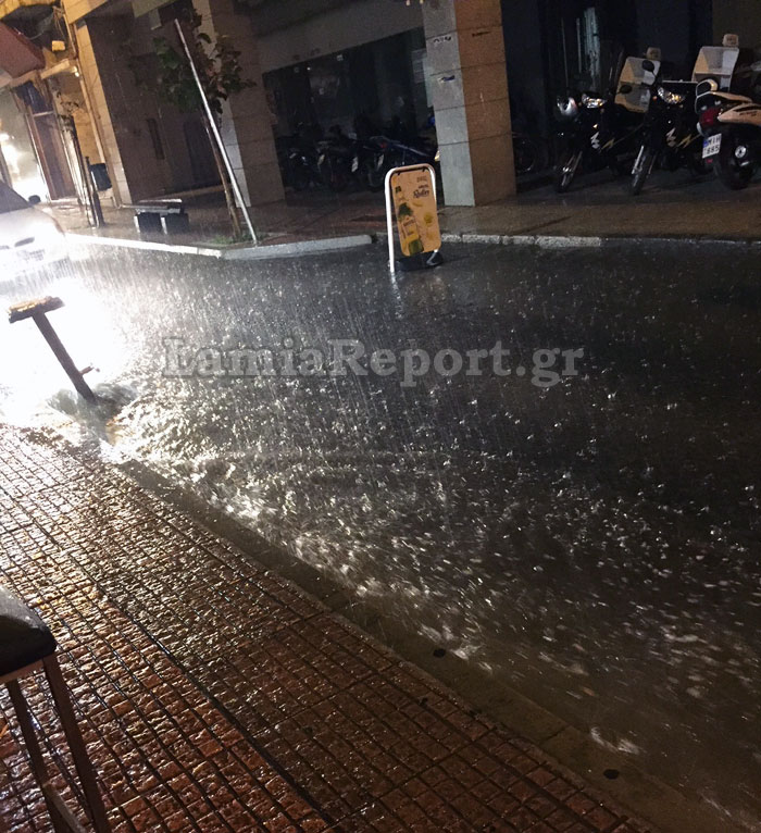 Η δυνατή βροχή που ξεκίνησε περίπου από τις 8 το βράδυ, είχε ως αποτέλεσμα πολλοί δρόμοι της Λαμίας να μεταβληθούν σε ποτάμια.