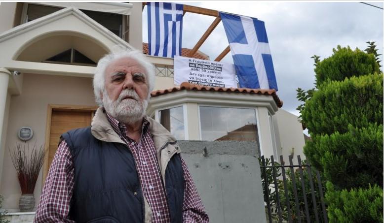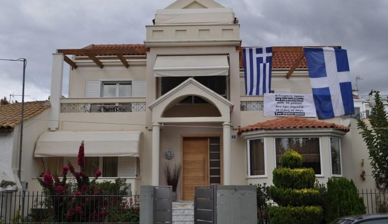 Ο Γιάννης Αθανασόπουλος ύψωσε δύο μεγάλες ελληνικές σημαίες έξω από το εντυπωσιακό σπίτι του, ωστόσο αυτό που τράβηξε την προσοχή ήταν το σύνθημα που αναφραφόταν στο πανό: