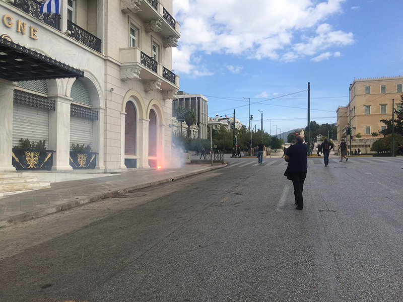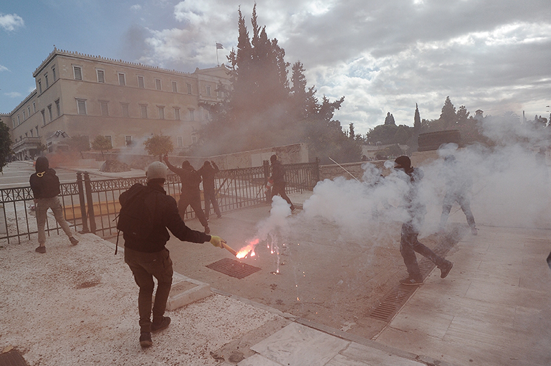 Οι ίδιοι νεαροί πριν κατευθυνθούν στα Προπύλαια είχαν ρίξει πέτρες και βόμβες μολότοφ στα ΜΑΤ στην πλατεία Συντάγματος, οι οποίοι απάντησαν με δακρυγόνα και ρίψη χημικών.