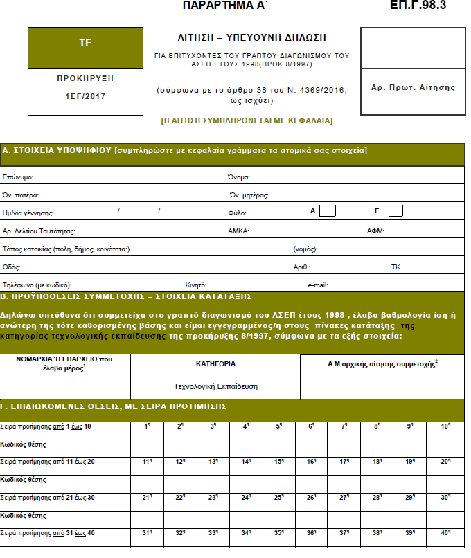 Δικαίωμα υποβολής αίτησης δεν έχουν μόνο όσοι από τους επιτυχόντες του ’98 έχουν ήδη διοριστεί στο Δημόσιο, όσοι δεν αποδέχτηκαν παλαιότερο διορισμό τους και όσοι έχουν ενταχθεί στον πίνακα διορισθέντων της προκήρυξης 1ΕΓ/2016, που αφορά στο διορισμό επιπλέον 2.135 επιτυχόντων σε θέσεις τακτικού προσωπικού πανεπιστημιακής, τεχνολογικής και δευτεροβάθμιας εκπαίδευσης δημοσίων υπηρεσιών και νομικών προσώπων του δημόσιου τομέα.