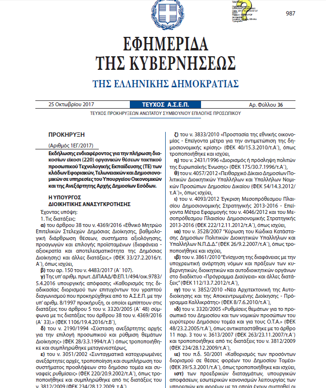 Όπως σημειώνεται στην προκήρυξη, όλοι όσοι έλαβαν, «στο γραπτό διαγωνισμό του Α.Σ.Ε.Π έτους 1998 βαθμολογία ίση ή ανώτερη της καθορισμένης βάσης της κατηγορίας τεχνολογικής εκπαίδευσης των κλάδων Εφοριακών, Τελωνειακών και Δημοσιονομικών», έχουν δικαίωμα διορισμού σε μία από τις 120 θέσεις του υπουργείου Οικονομικών και τις 100 θέσεις της Ανεξάρτητης Αρχής Δημοσίων Εσόδων, που προκηρύχθηκαν.