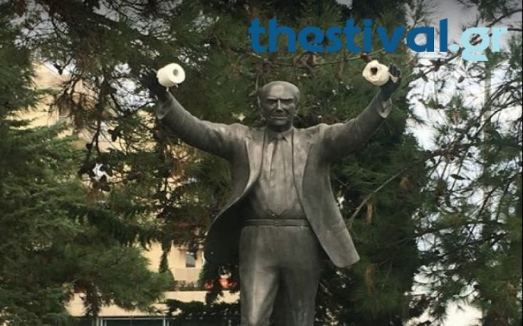 Θεσσαλονίκη: Κρέμασαν χαρτιά υγείας στο άγαλμα του Ανδρέα Παπανδρέου