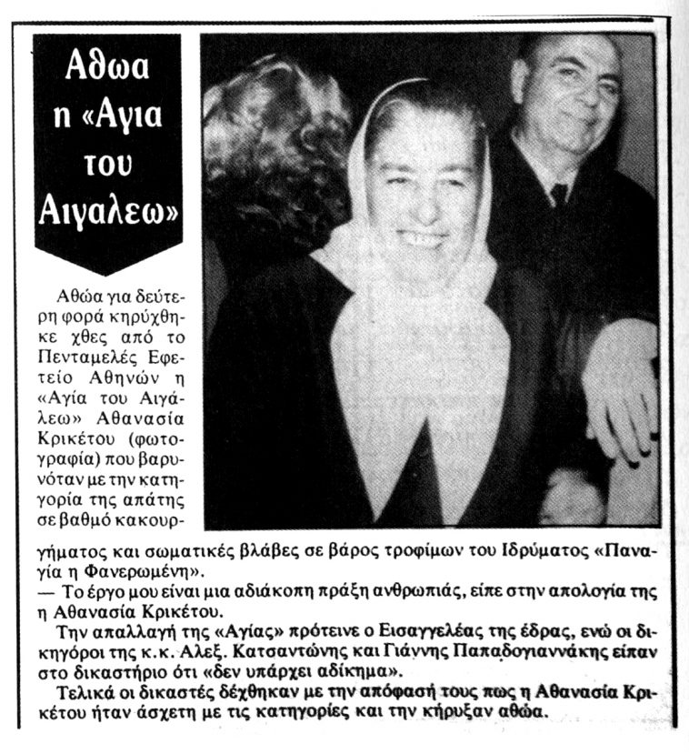 Το 1980 οι δημοσιογράφοι Γιάννης Δημαράς, Γιώργος Λιάνης και ο Κώστας Χαρδαβέλλας, αποκαλύπτουν στην εκπομπή τους την τεράστια περιουσία της, η οποία αποτελείται από σπίτια, οικόπεδα, και χωράφια σ’ όλη την Ελλάδα. Ακίνητα στο Αιγάλεω και το μοναστήρι-φρούριο στη Μάνδρα Αττικής. Η αξία τους αγγίζει τα 400 εκατομμύρια δραχμές ενώ τις τεράστιες εκτάσεις, τις καλλιεργούσαν αφιλοκερδώς οι πιστοί. Η Αγία Αθανασία του Αιγάλεω, κάθεται στο σκαμνί αφού έχει προηγηθεί επερώτηση στη Βουλή για το ίδρυμά της.