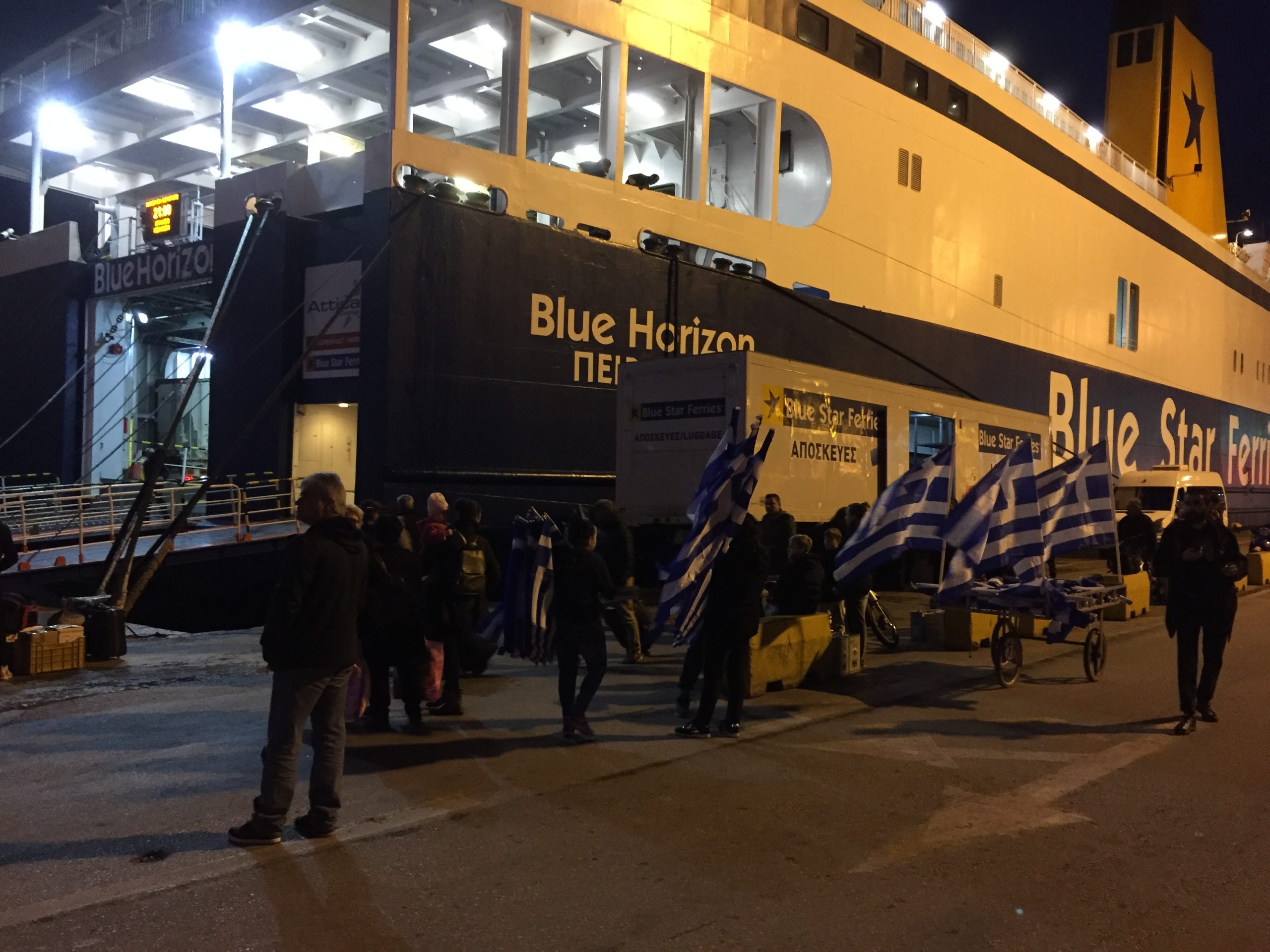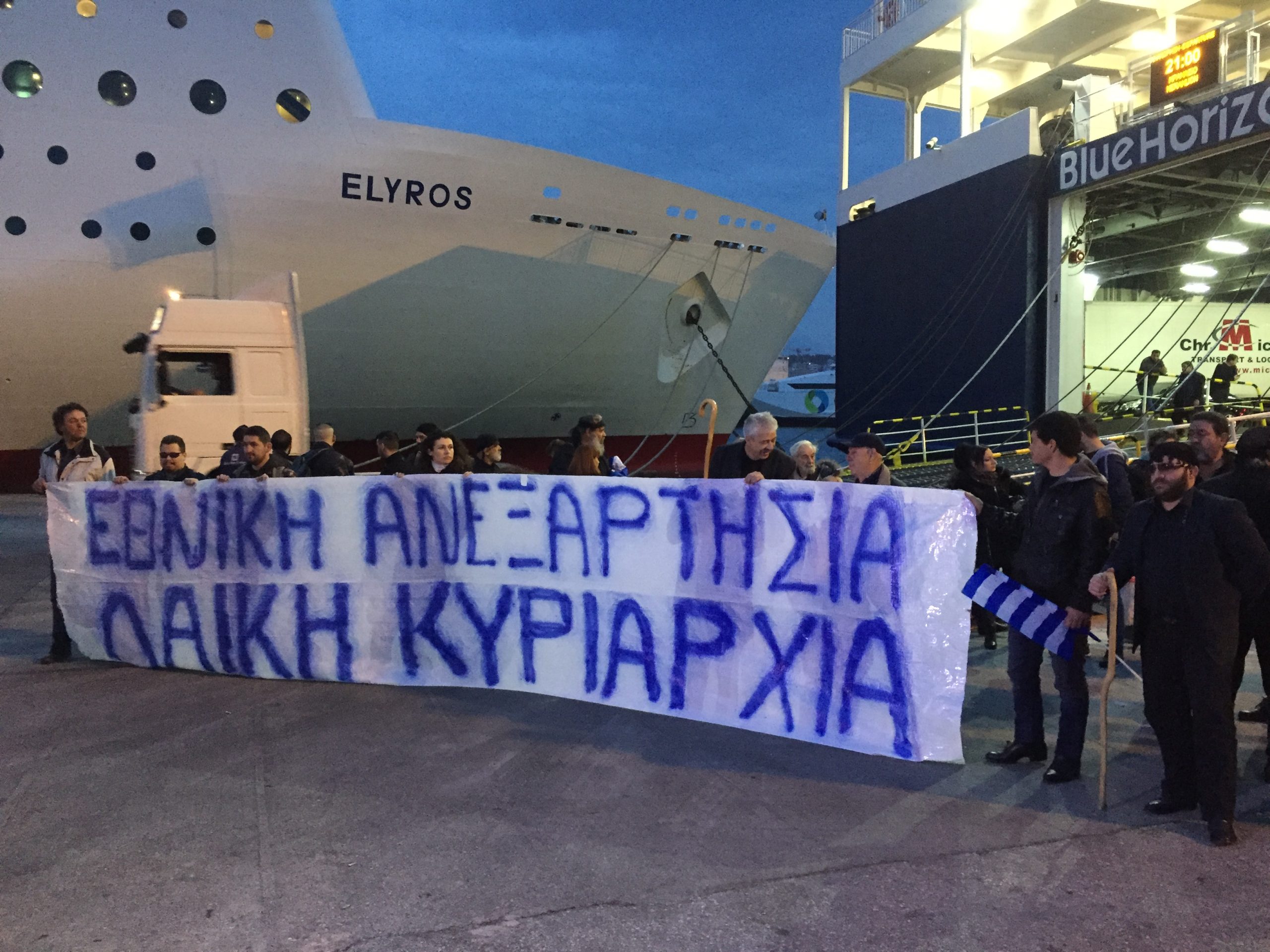 Νωρίς το πρωί έφτασαν στον Πειραιά περίπου 1.000 Κρητικοί- με τρία πλοία από τα Χανιά και το Ηράκλειο- πολλοί από αυτούς φορώντας παραδοσιακές φορεσιές και με ελληνικές σημαίες στα χέρια. Μετά την αποβίβαση, έψαλλαν τον Εθνικό Ύμνο και τραγούδησαν το «Πότε θα κάνει ξαστεριά» και το «Μακεδονία Ξακουστή» συνοδεία κρητικής λύρας.