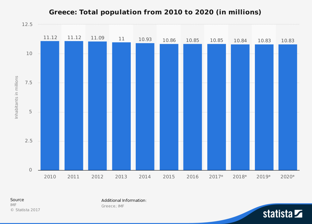 Η στατιστική απεικόνιση της ομάδας Statista δείχνει τον συνολικό πληθυσμό της Ελλάδας από το 2010 έως το 2016, με εκτίμηση έως το 2022.